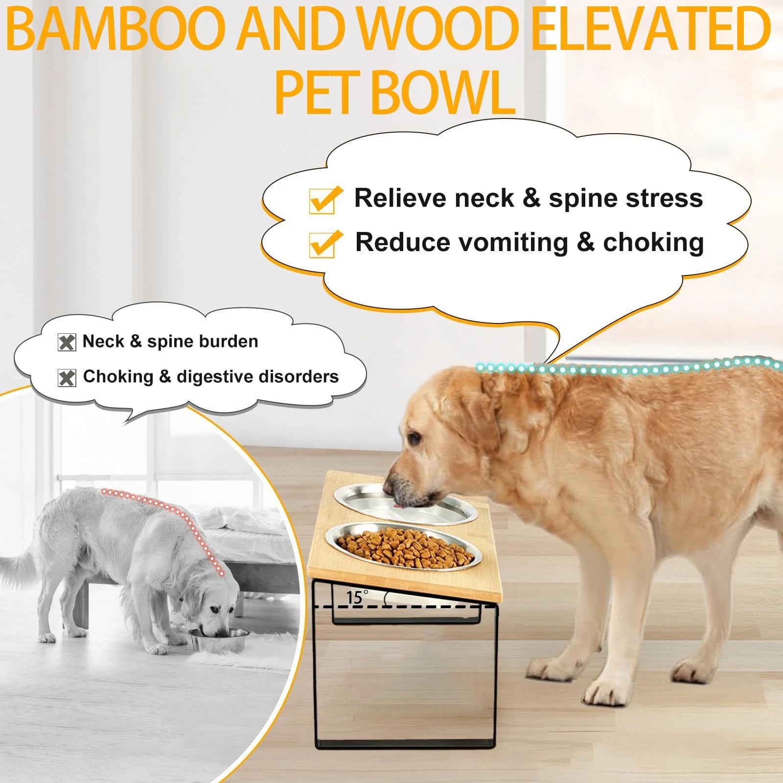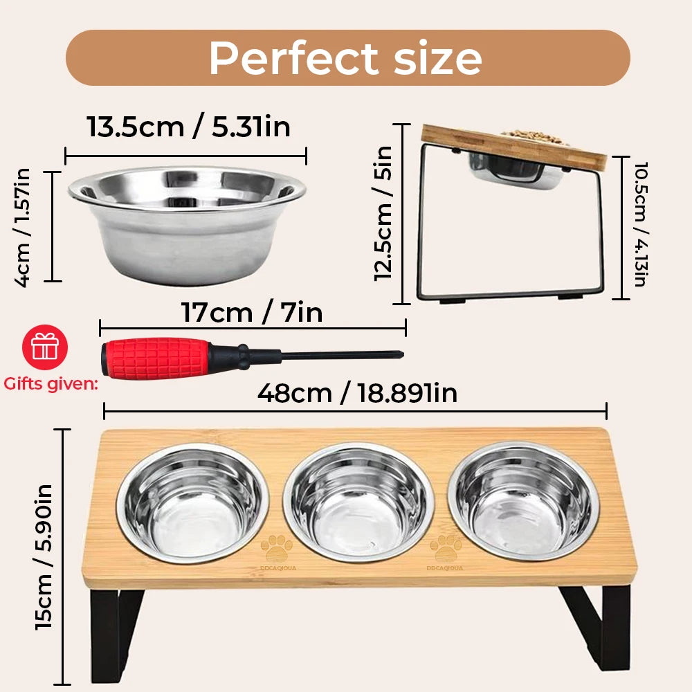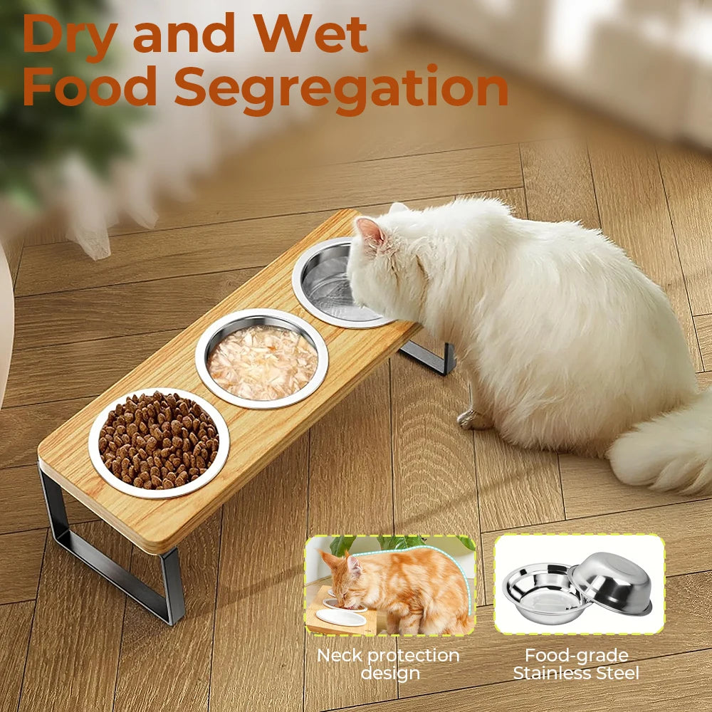 Sistema di due o tre ciotole in acciaio inox per acqua e cibo, dotata di supporto in metallo e legno che le rialza ed inclina, facilitando la posizione degli animali per mangiare e la pulizia della postazione.