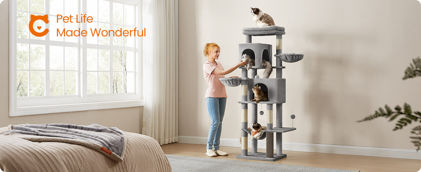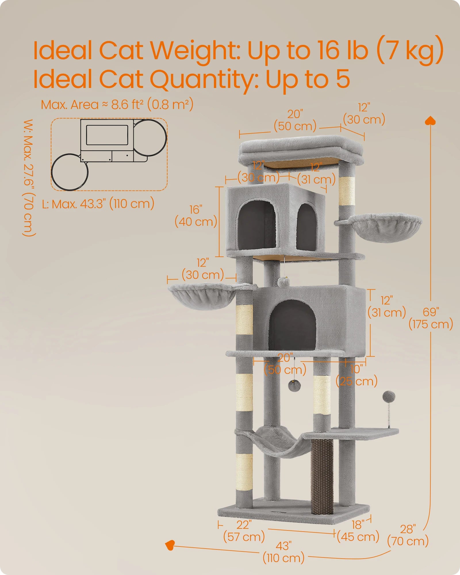Feandrea albero per gatti grande, torre per gatti alta 175 cm, condominio per gatti multilivello con 2 cave, 2 cestini, 5 tiragraffi