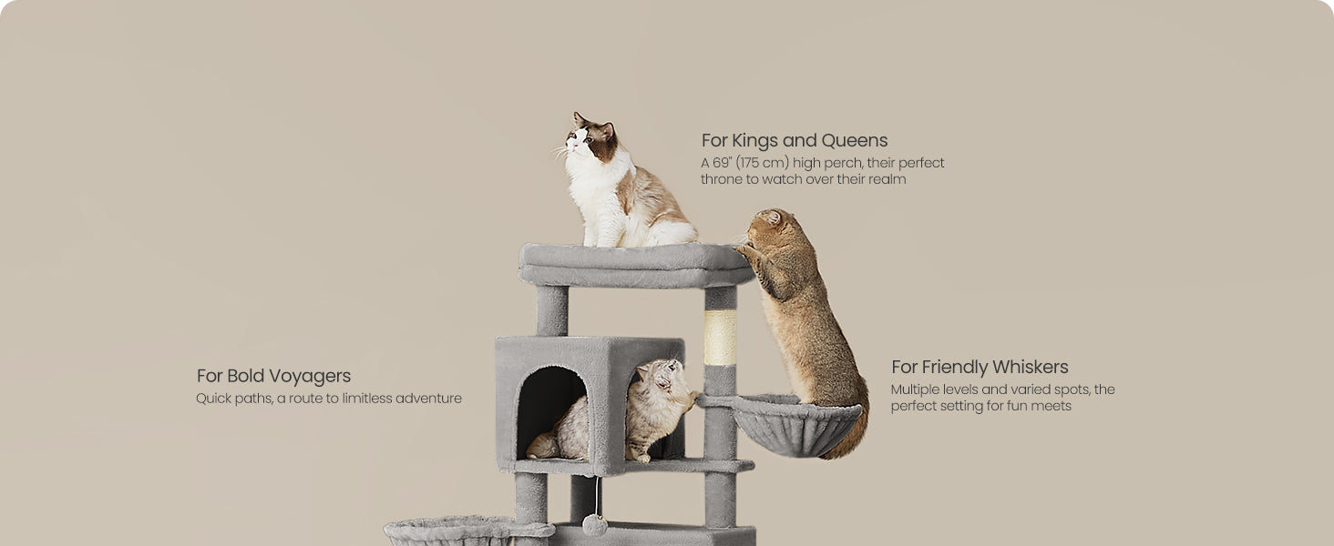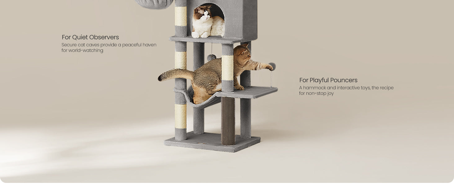 Altezza 175 cm, divertimento multilivello: i tuoi cari potranno giocare e rilassarsi ampiamente su questo tiragraffi.Con 2 grotte, 2 lettini, un'amaca accogliente, un'ampia piattaforma e giocattoli attraenti, è ideale per le famiglie multi-cat