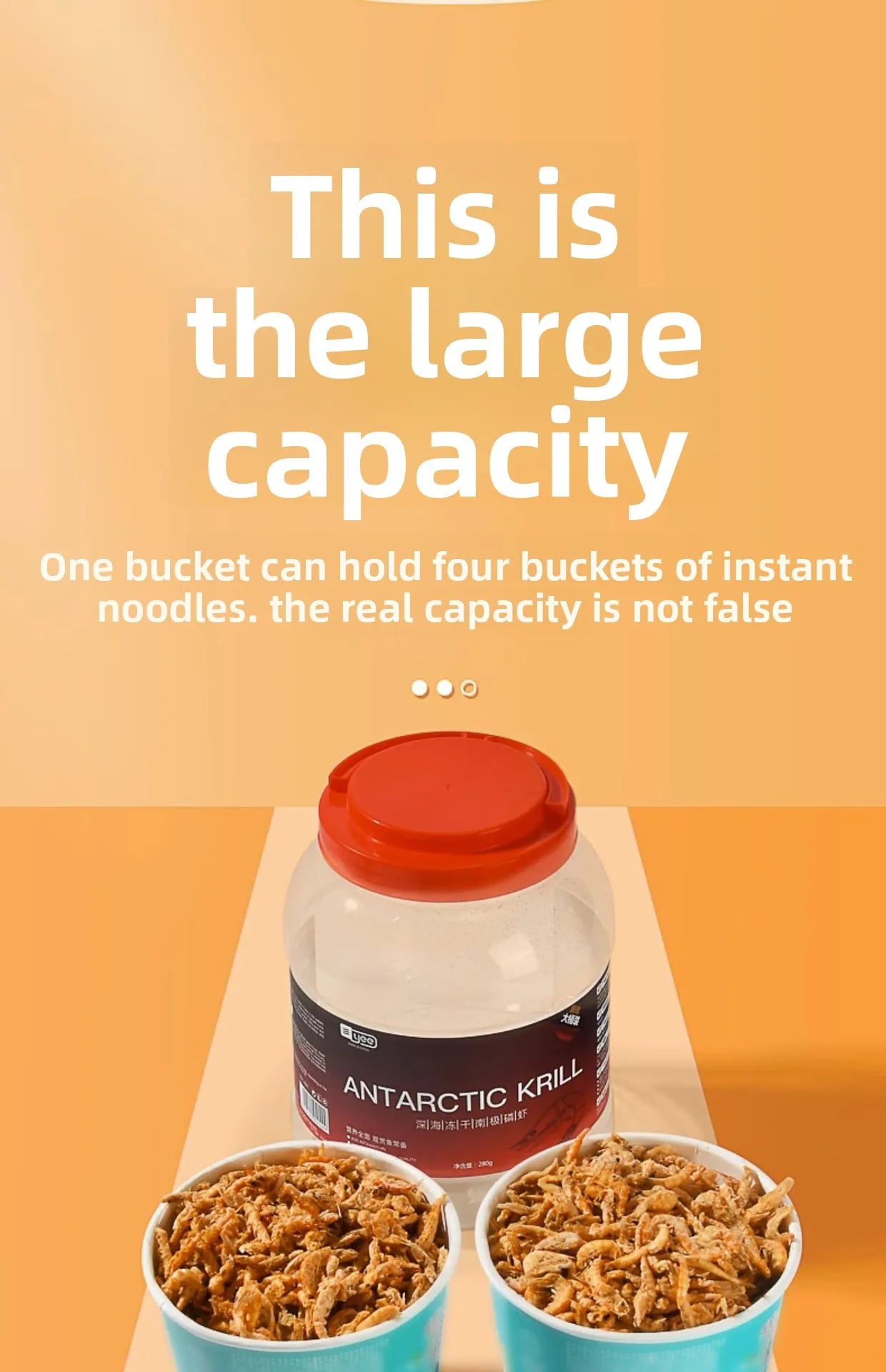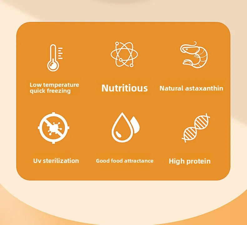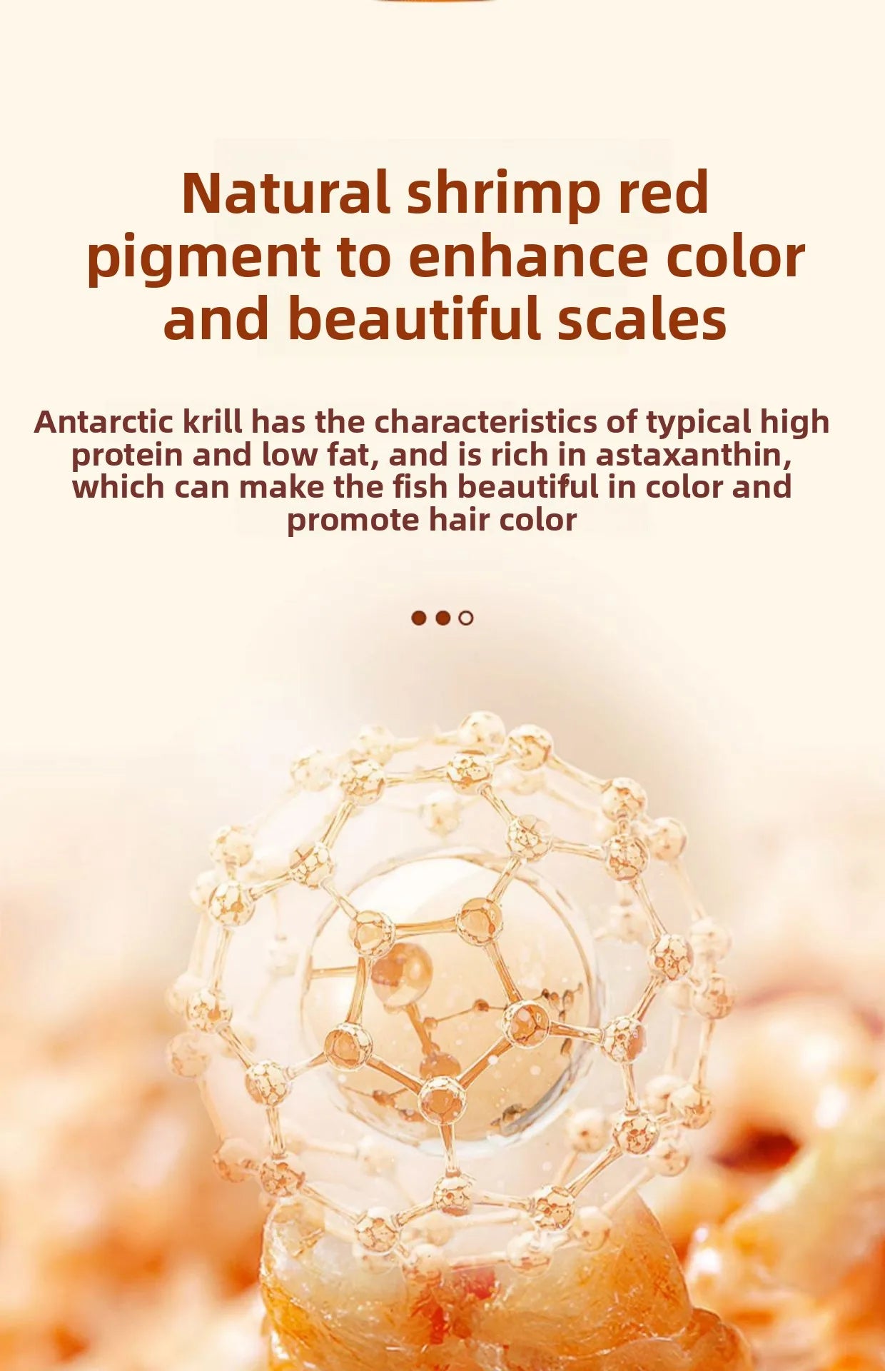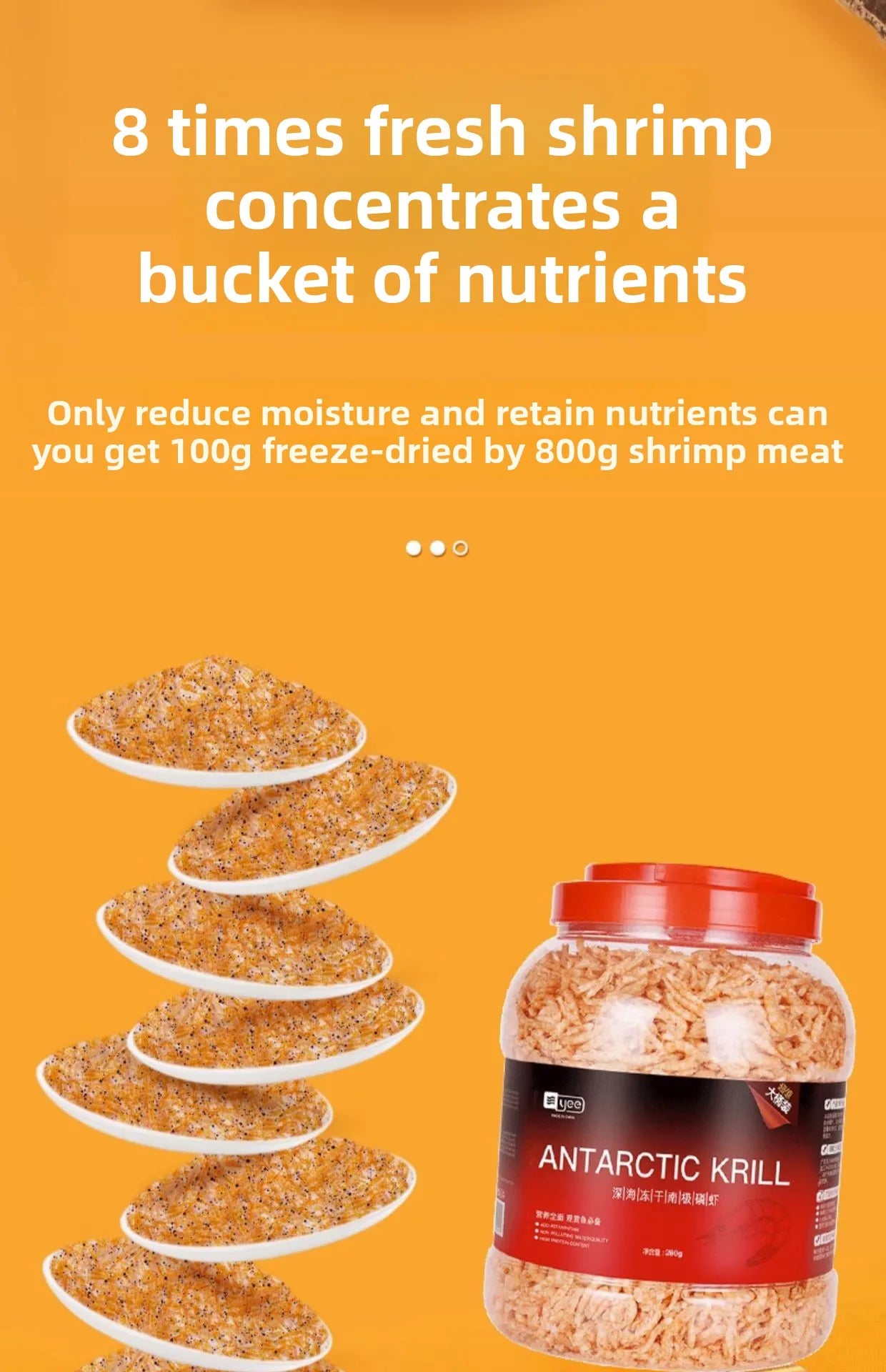 Contiene naturalmente axtantina e proteine, liofilizzato a UV, appetitoso, nutriente, si conserva anche in freezer a basse temperature.